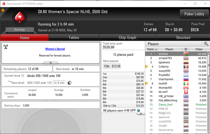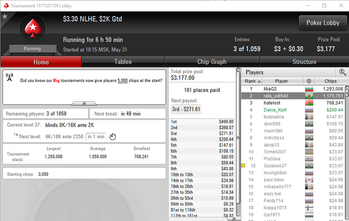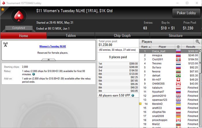 Спасибо! Ой, раньше играла много дип турбо 10к начальный, люблю регспид 5к начальный, ещё регспид 3к начальный. Всякие хайпер турбо не моё, слишком все дисперсионно. И с начальный стеком 1.5к не очень, не поблефуешь)