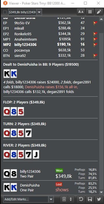 Доброго дня Вчера откатал не очень, пару ошибок допустил на стек, что-то на подобии по лфопу 237 в радугу с JJ сыграть на стек, у оппа QQ, ну и в моём любимом BIGe по 7.7, за огромный стек выставились префлоп, при чём опп сыграл лимп-пуш, с 88 у меня КК ещё один короткий 20+бб с J10о заскочил, 8 положили на флопе , в остальных не складывалось с самого начала((((