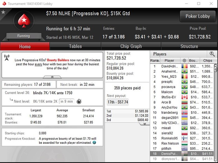 Всем доброй ночи, после небольшого перерыва, я снова принялся за работу! Решил пока убрать старзы, подключил румы с меньшими полями: PartyPoker, Ipoker, 888 и на днях добавлю Poker King. Играть буду пока первое время турниры в районе 5$, сегодня сразу с места в карьер, очень порадовало поле на Party , из 5 турниров 3 хороших прохода, в общем много писать тут не буду! ТОП1