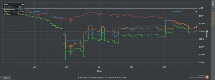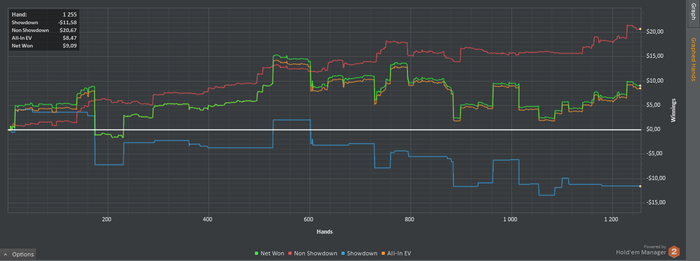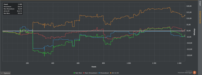 Start Bankroll 619,01$; Stop Banrkoll 604,43$; Cтолов 6; Мини сессий 2; Рук: 1201; Время = 120 мин; Результат = -14,58$ bb/100 = -1,44; Моя оценка = 5 с 10. Цель на день Net Won (40$) выполнена на -36,4%; Цель на день Hands (3600) выполнена на 33,3% Цель Руки на пятый игровой отрезок за все дни (333К) выполнена на 51% (169988 рук); Цель NW & RB на пятый игровой отрезок за все дни NW (2000$) выполнена на 7,8% (157,89$), RB (200$) выполнена на 107,5% (215$); Comment: Даун+Кривой День!!!