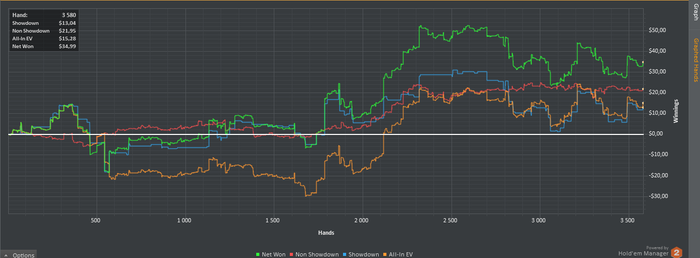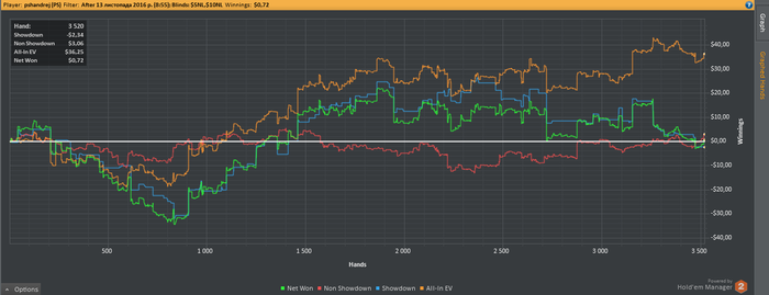 Start Bankroll 604,43$; Stop Banrkoll 639,07$; Cтолов 6; Мини сессий 6; Рук: 3580; Время = 360 мин; Результат = 34,99$; bb/100 = 7,21; Моя оценка = 5 с 10. Цель на день Net Won(40$) выполнена на 87,4%; Цель на день Hands (3600) выполнена на 99,4% Цель Руки на пятый игровой отрезок за все дни (333К) выполнена на 52,1% (173568 рук); Цель NW & RB на пятый игровой отрезок за все дни NW (2000$) выполнена на 9,6% (192,88$), RB (200$) выполнена на 107,5% (215$); Comment: Даун, потом АП, потом даун...