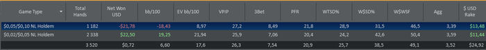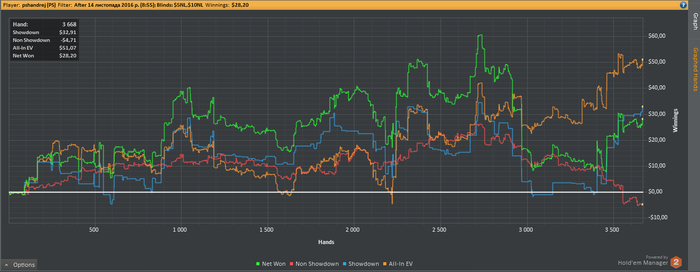 2. 10:30-11:30=60мин | 553 руки | ...-22,44.. | 49,91 | 5 с 10 | Comment: После АПа плотный даун, все как всегда… Texника: Норм, без грубых…; Rating: 5 с 10 . Психология: Норм, на уровне… ; Rating: 5 с 10 .