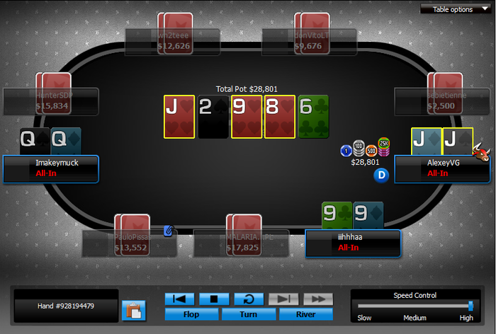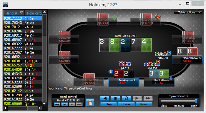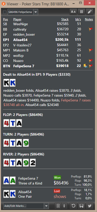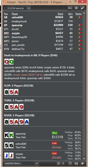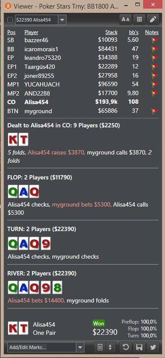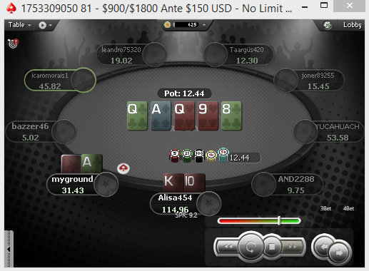 11 ББ Офигенская раздача, проиграл как лопух ! но взял себе на заметку, такого сайза 3 бета с АА я еще не видел, отлично сыграно респект Felippe. Часто с ним играю на 7/5, 11,16/5 сильный оппонент рук мало всего чуть больше 600 (( Нет возможности сделать полноценный анализ его игры.