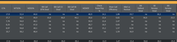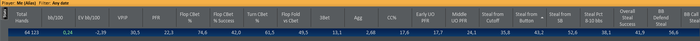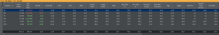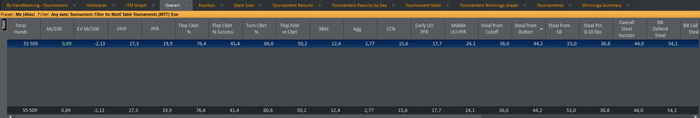 aspid301, А можешь сделать просто МТТ, т.к. спины сильно искажают ситуацию (был не в курсе, что ты еще и спины играешь, так бы сразу попросил)) И еще, что для меня сразу бросается в глаза, это не понятно какой спектр колд колла и 3бета у тебя...Просто что один что другой параметр отличается от моих в 1.5-2 раза.. И скажи сколько у тебя ХМ показывается WWSF, что бы понять как ты широкий спектр постфлоп разыгрываешь..