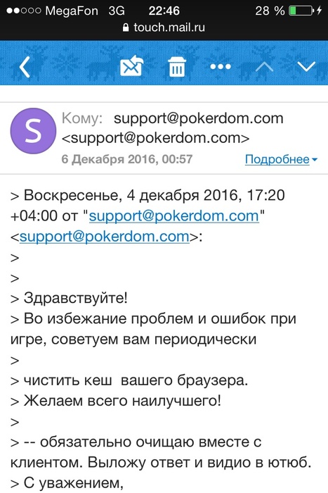 В покердоме же иногда работник службы поддержки, решивший за день отлично десятки вопросов, допускает ошибку в отдельном непростом случае. Потом происходит что-то ещё - и начинает виться клубок. В данном случае представитель саппорта дал ошибочную информацию на несколько сот рублей. И раскрутился маховик. И понеслась. Я понимаю, что есть персональные ненавистники у разных представителей рума в частности, да и у самого проекта в целом. С ними все просто и понятно. Они пишут два раза в году - и всегда негатив в сторону одних и тех же. Но у меня просьба к адекватным людям, которых, к счастью на форуме большинство, не вестись на поводу у провокаторов.