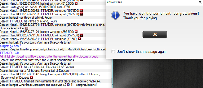 Я не то выделил, хотел что-то написать про страдл)) Онлайн 6мах или 9 первое место? А мой первый турик был 0.5$ из 4365 человек - девятое место на финальном столе +$17.38 (95% денег были выше, 1е место 350$ вроде...