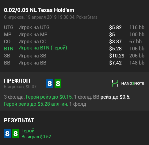 По статистике он ЛАГ, поэтому я думала, что у него неплохое дро, скорее всего Ах или АDs. На ББ у него по статам 25% 3бет против СО и БАТТ. У меня тоже было неплохое дро (двусторонка) и овер пара. В общем, я сегодня уже думаю, что надо было просто кол играть и не переставлять на флопе, хотя терн тоже карта, которая ничего не изменила... в тот день, я бы все равно вколола)) Такой просто день был...)):