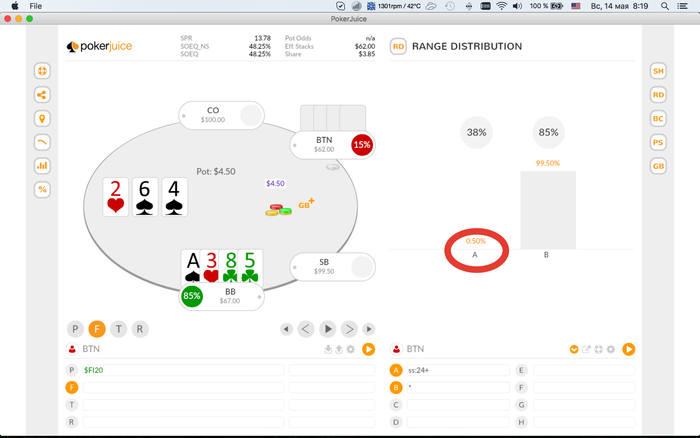 Таких рук (ФД + допер или сет) в диапазоне открытия с батона 20% ровно ПОЛПРОЦЕНТА