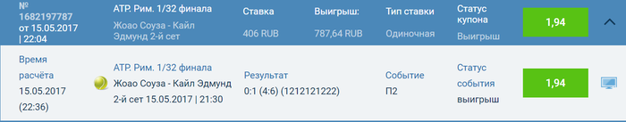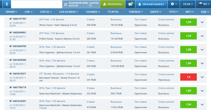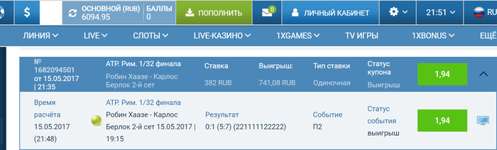 1-шаг-Карлитос пахарь,реально второй Давид Феррер,Робин же напротив упустил шанс когда подавал на сет,Карлитос не должен упускать ATP. Рим. 1/32 финала. Робин Хаазе-Карлос Берлок 2-й Сет Робин Хаазе - Карлос Берлок 1x2 П2 1.94