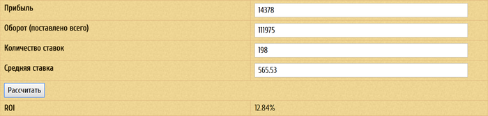 Как и обещал сделал подсчет профита и рои за первую половину этого месяца(15 игровых дней) Напомню цель с банкроллом 10к делать в месяц 30 000р(то есть 300% прибыли от суммы в месяц) Высокие цели=+ к мотивации Прибыль за 15 дней=14378р ROI 12.84%