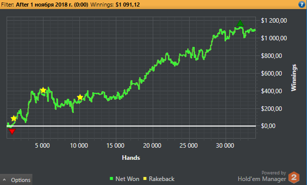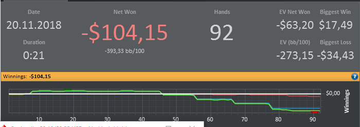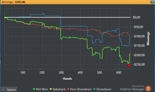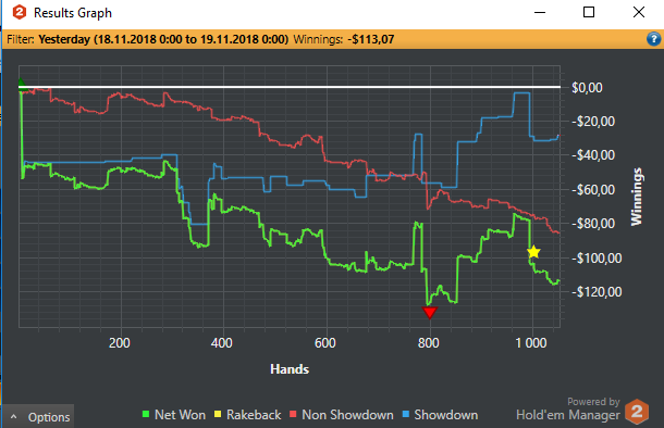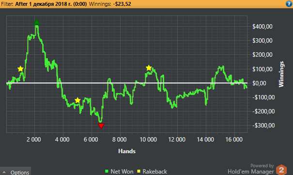 Ситуация, конечно, не очень, с пика -500$ примерно, график не смотрел и не хочу портить себе настроение) Режим пошел по пи%де, поэтому играл не в оптимальное для себя время и много-много важных для себя вещей не делал, например, настройка на игру минут 10-15. Выиграл 400$ в начале декабря и уже подумал: "Заебись, сейчас пойдет!" , но нет. Да еще к тому же о деньгах начал думать во время игры, что тоже для меня ведет к потере концентрации.