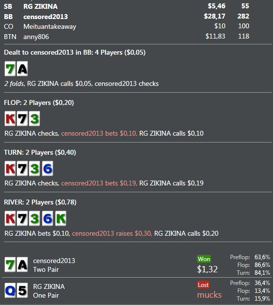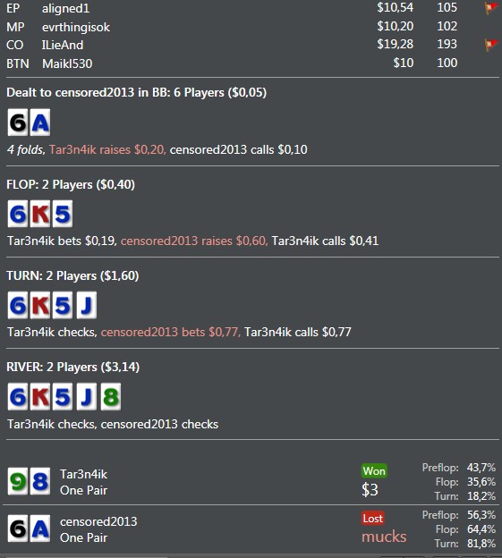 В общем просчитал я эту раздачу со всех сторон. С мой стороны раздача сыграна хорошо, как оказалось. Рейз флопа не плюсовый был, но это только в том случае, если на нем и остановиться. Терн мегоплюсовый бет, а ривер просто плюсовый бет)))