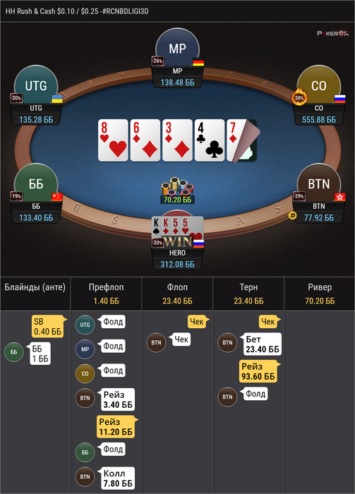 Блин, как вы собираетесь чек-пушить флоп в первой, если там было сыграно чек(Хиро) - чекбих (опп) ?
