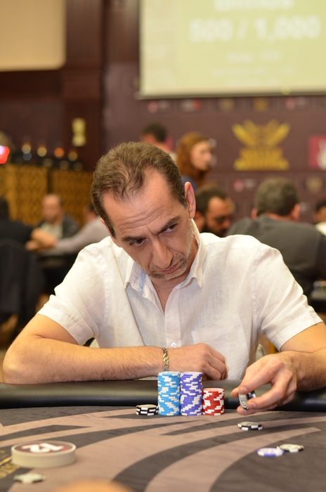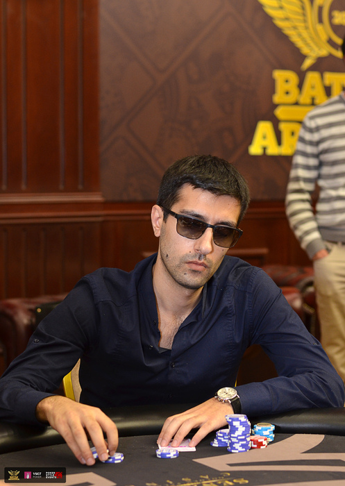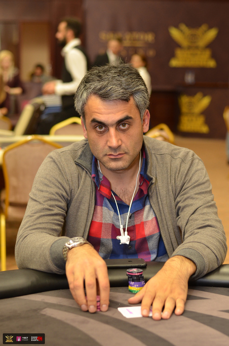 В турнире MAIN EVENT (DAY 2) игра идёт hand-for-hand. В игре остался 21 человек, минимальная призовая выплата составляет $750. На фото игрока из Армении почти выбили, однако ему удалось выжить в префлоп выставлении > . Борд: