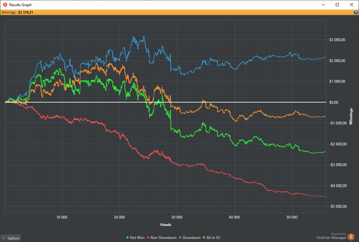 Коротко об этой неделе: заметил что у меня наблюдаются два разных режима мышления. Один - логический, срабатывает когда я разбираю руки и помогает находить лучшие решения в любых ситуациях. Второй же - энергосберегающий. Этот режим включаеться во время самой катки видимо для того чтобы сохранять энергию и не сильно перетруждаться перед разбором. Собственно когда я играю в больших спотах, то только через минуту после окончания раздачи у моей головы проносяться мысли, типо "лучше было сфолдить" или "пуш не имел никакого смысла". Короче говоря я тупо туплю и не всегда успеваю продумать план на раздачу за что неплохо поплатился. Попробую на время отключить 100-200 нл чтобы привести свои мысли в порядок и вспомнить тот приятный вкус плюсовой сессии.