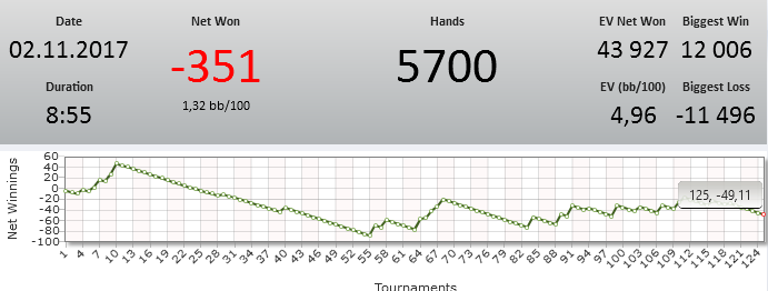 Пока холдем кушает в последние два дня неплохо. Надеюсь в следующий день все будет иначе Слил по синглу за 11 турик, посливал еще ху по 3.50 и по 7 поушатавали меня. Не буду плакаться по типу мне не заходило и искать какие либо еще отмазки. Надо стараться по-другому смотреть игру, а то как-то такой настрой я потерял ..... Завтра надеюсь все будет иначе