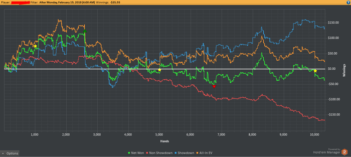 Когда я перестал работать над улучшением игры, я предполагал что увеличу количество самой игры, но увы играть я больше не стал, а попутно и растерял уверенность в том что делаю. С завтрашнего дня возобновляю работу в своём старом режиме "сон-3часа свободны-3часа теории-7игровых часов включая перерывы-3часа свободны-сон". Так как плана по тому над чем работать сейчас нету, буду брать рандомную раздачу, скорее всего зарандомлю в софте, против одного из оппов с которым часто зарубаюсь. А там попутно появятся и вопросы, на которые придется искать ответы. Неделя ужасная получилась, и результат - только моя вина. Не вижу смысла выставлять по позициям, всё испорчено тонной ошибок. Только график: