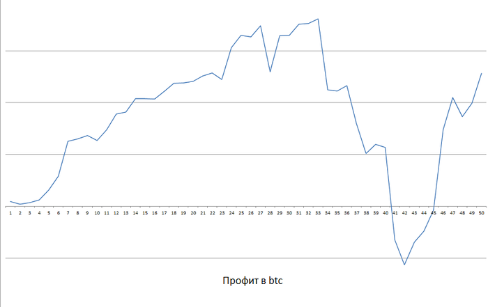 Выкладываю результаты сразу за все 80 сделок. Первый график профит в % от суммы контрактов в каждой позиции. Второй профит в бтц.
