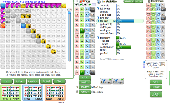 User, привет! Думаю, на такой текстуре полублеф-пуш по терну будет не очень хорош, сам таким страдаю)) Смотри, из этих его комб AJ+ ты вряд ли что-то выбьешь по такой линии (и в целом его диапазон по терну очень силен): Имхо, ты изображаешь тут строго 3 комбы TT и 2 комбы ATs, остальное - это блефы со всеми ФД и бродвейными гатшотами, + ты капнут на AA и часть AK, а он нет, и вряд ли ты так будешь пушить A2 по терну, на его месте легкий колл.
