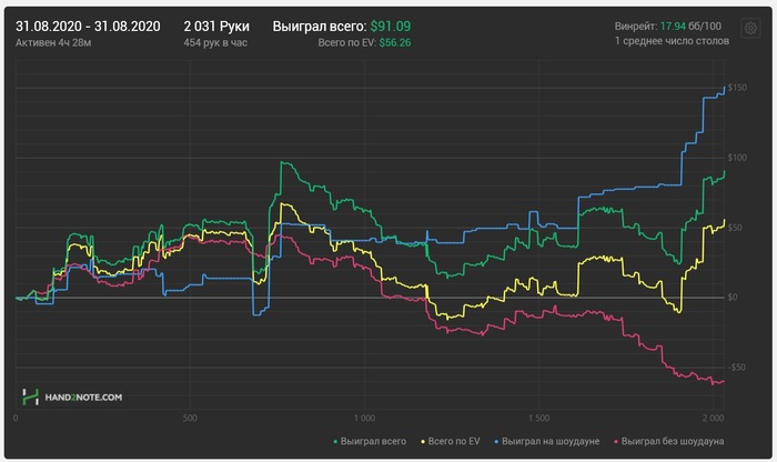 Не знаю почему, но H2N теряет довольно большую часть раздач на стек, реальный результат по кассе составил +400$ по заданию, +252$ по кассе и +55$ рейкбека в сундуках. И получается что я оформил свой незапланированный Best Months +707$. 138 часов гринда покера + 128 часов на основной работе. Реальный результат на нл16 получился где-то 3,5-4бб/100 с учетом потерянных рук. Еще постоянно было ощущение что евшки в потерянных раздачах зарыто еще больше. Считаю это очень достойным, так как постоянно находился не в оптимальном состоянии и играл на пределе своих возможностей. Спасибо всем кто прочитал это полотно и прожил мысленно этот месяц со мной. Теперь продолжаю катку в удовольствие, так же в зуме, постараюсь появляться хотя бы раз в недельку) Всем удачи, увидимся за столами!!!