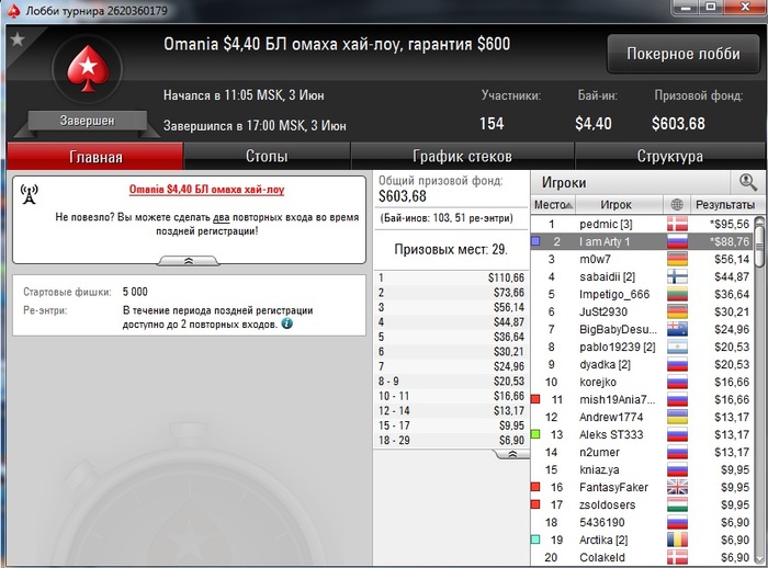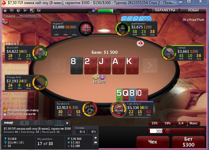 -33$ В целом неплохо, неплохо учитывая вечернюю картину ахаха, с утра то плюсанул, а вечером просто один минитм на около 30 сыгранных турниров и снг, бывает и такое, помню давным давно когда еще играл снгшки по холдему 45-макс, там призовых мест было 7, я их играл в плюс с ROI 20%, так я один вечер отыграл ровно 30 турниров не то что не попав в итм, а даже не попав в топ-15, тогда был мой самый удивительный отрицательный выброс дисперсии в течение дня, но тогда я к середине подтильтовывал конечно, а сегодня жаловаться не на что, отыграл я и утром и вечером хорошо, стал подключать и утром и вечером мттшки на PokerOK, хорошие составы, почему бы и не поиграть, играю там T-builder'ы, Bounty Hunters и Omaholic, да я не очень хорош в обычной омахе, но турики по доллару, в которых интересный экшен я играть вижу смысл, даже если это и отрицательно по матожиданию, хотя скорее всего положительно, но эти плюс-минус 10 центов ожидания все равно погоды не делают поэтому катаем не задумываясь, помню когда играл снгшки по холдему на PS я знал много и по пуш-фолду, и по рестилам, сейчас в пограничные моменты мозг ломается, уже мышление адаптировано под хайлу и играть холдем сложно, бывали даже в начале месяца моменты, когда я не обращал внимания на четвертую карту одной масти на доске, забывая что в холдеме можно использовать одну карту для комбинации и коллировал ривер когда надо было выбрасывать Завтра с утра высплюсь и съезжу к бате на дачу до вечера, если погода позволит позагораю и конечно же баня Вечером покатаю, если вернусь не очень поздно, скорее всего играть буду, надо будет открыть сундуки и подвести итоги месяца, в котором в первой половине по результатам все было беспросветно и плохо, но по итогу получился плюс и на PS и на PokerOK. Ах да, вот место скопления моей вечерней удачи сегодня