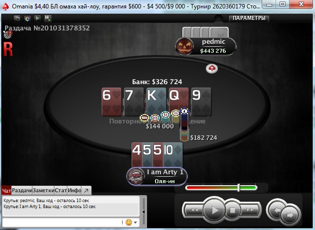 +102$ Не зря все-так решил играть сегодня Финалка с утра в нокауте и дележка в топ-2 Омании Отыграл 7 часов, вечером играть не буду, устал Во время этого блефа в топ-2 после ререйза оппонента на терне душа ушла в пятки, но к счастью он почти сразу выкинул и у меня появился хороший стэк, а то в хедзап выходил имея в 4 раза меньше фишек