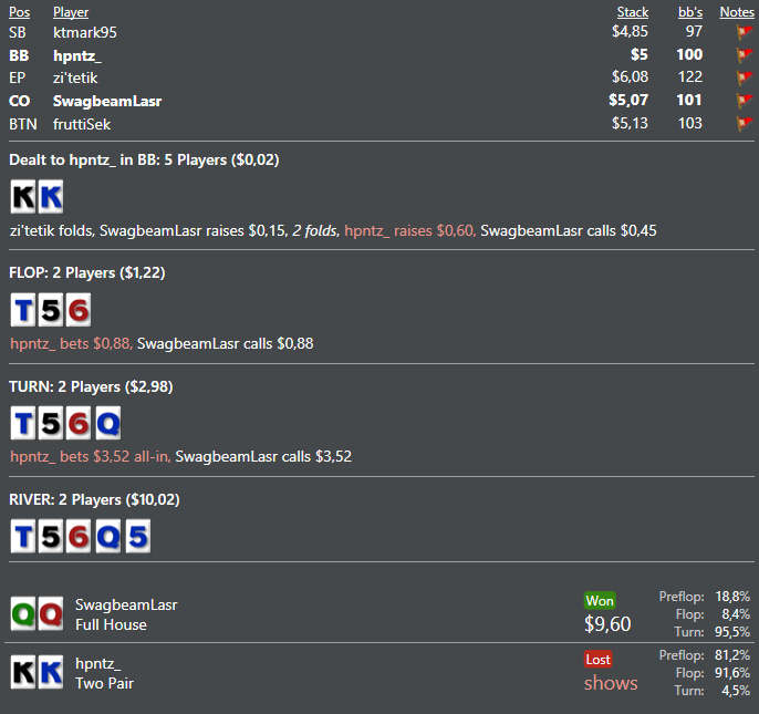 мне самое важное было чтобы фиш сбросил, потому что сразу становится понятно что мы впереди всех, ибо рег с КК АА в фиша ебашил больше, на его 4бет скорее бы пушнул, а так как он заколил просто, то я во-первых думал что там либо 99+, AJ+, но точно не КК и не АА, а тут вообще ебать 56 сьютед пиздец =)))