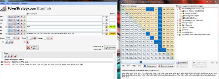 Вообще то как то так без учёта его полублефов с Ах сьют кроме 2 комбы А7 и А8s и у нас 34%на победу против 14% остальное на дележку ну и фолд эквити тоже есть а если ты начнёшь фолдить стриты в добок ещё имеющие флешдро то ставь крест на красной