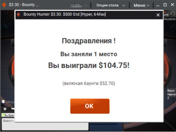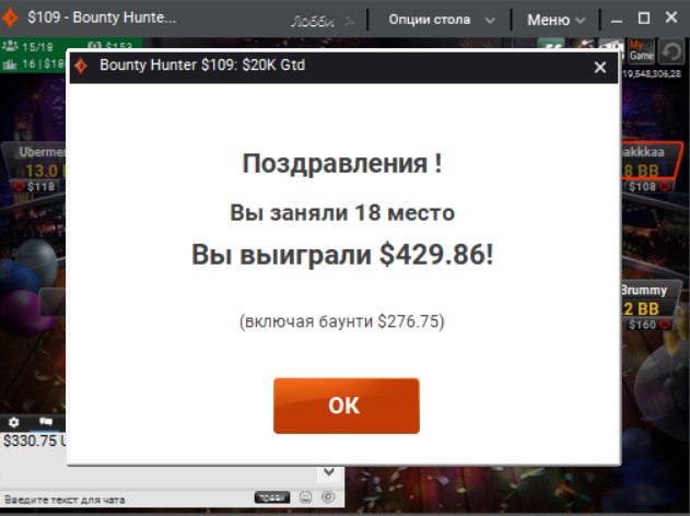 Сегодня отобрался с 11$ на Bounty Hunter 109$, играл с самого начала, а не с конца поздней реги и понял что в этом есть свой смысл, шансов на успех больше, диспы и выставления с 10бб(если прыгаешь в позднюю) меньше. На БХ неплохо сложилось и удалось нормально подзаработать. Решающую раздачу сыграл на ББ с , в меня запушил сб и зачем-то на ривере пришел туз Безумно запомнилась раздача на бабле, когда агрофиш??? пушит свой стэк около 10бб, у меня 15, за нокаут 168$!и я все равно досиживал бы до призов +-, т.к ББ на мне и кое-как бы пересидел коротыша. Радовался ппц