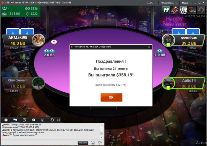 Что касается катки - переапался на ГГ, втащил в год моде турик, по итогу БР на покерке составляет 500+ $, недавно депал 33$, буст пошел)) А когда катал кэш, то месяца за 2.5 максимально удалось сделать 500~ при депозите 200. На пати было несколько финалок, в одной занял 4-е, насыпали 133$, также катал Daily masters за 11$, самый долгий турик, только стадия призов начинается после 4-х часов, там вылетел 17, дали 53$, на БУ на 16ББ раздали AQo, на ББ посмотрел на АА, хз фолд не фолд(я просто опен), с учетом, что есть короче парень и пейджамп 1.5 баина.