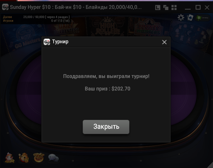 Сыграно около 30 турниров, на покерке 2-е и 8-е место, суммарно выиграл долларов 50-60$ чистыми, это только на ГГ.
