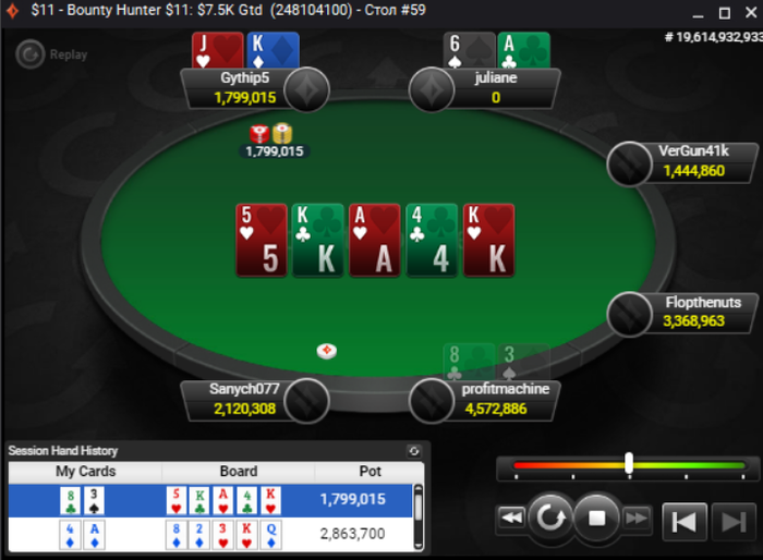 Также начал регулярно катать саты на Баунти хантер 109, не смотря на плотный состав в лейте удается выбивать парней. В мидл стадии BH 109 перекрыл коротыша за нокаут с АКо на 52бб, в итоге амбассадор пати покер Matthewstaples вписался с AJs на 46бб(насколько это плюсовый кол я хз) и поймал трипс JJ, у меня осталось 6ББ, он стал чипаком... я немного тильтанул, но позже с 2.4ББ удалось утроиться с А5s, cлед раздача ATs>KK, ну и мы досиживаем до призов с мертвой!