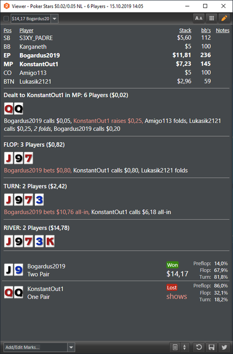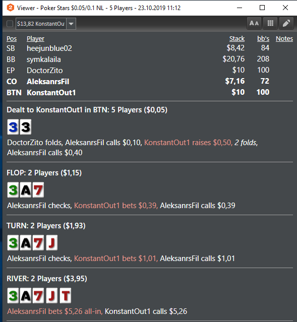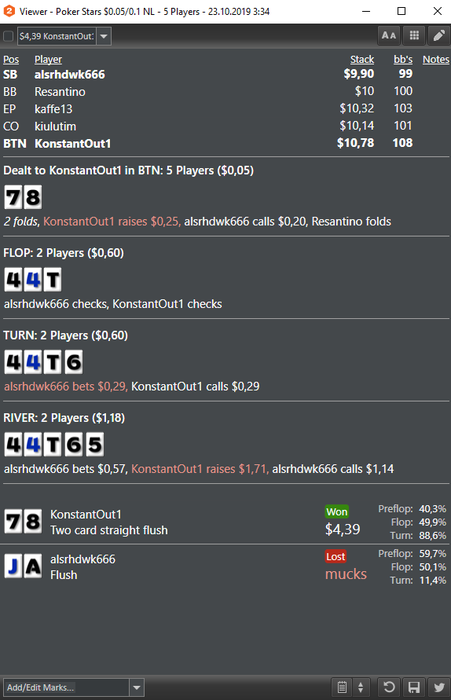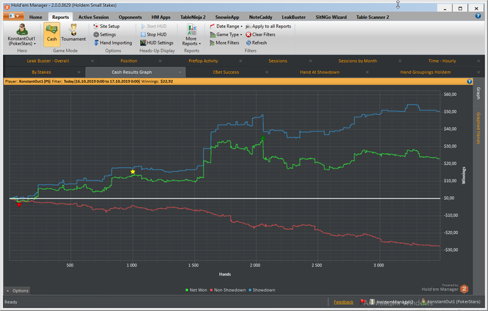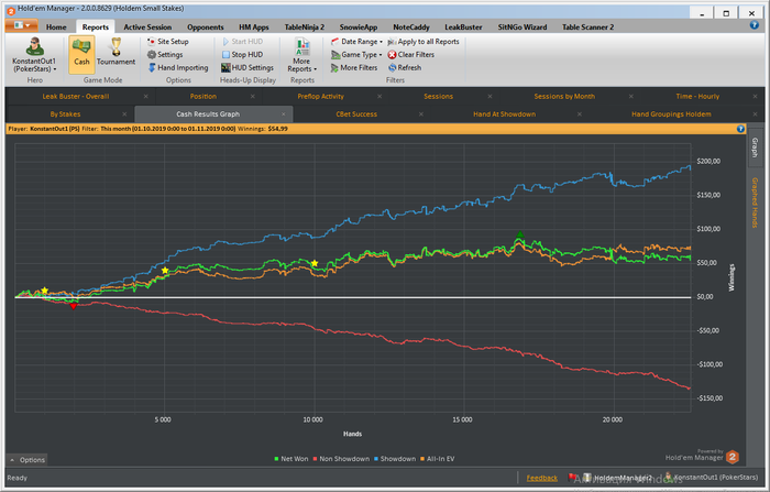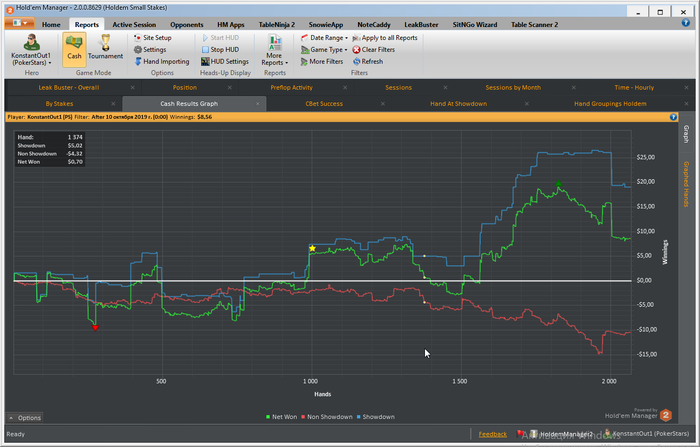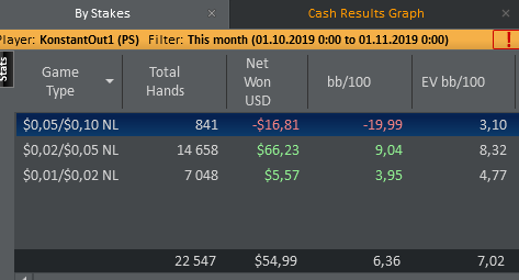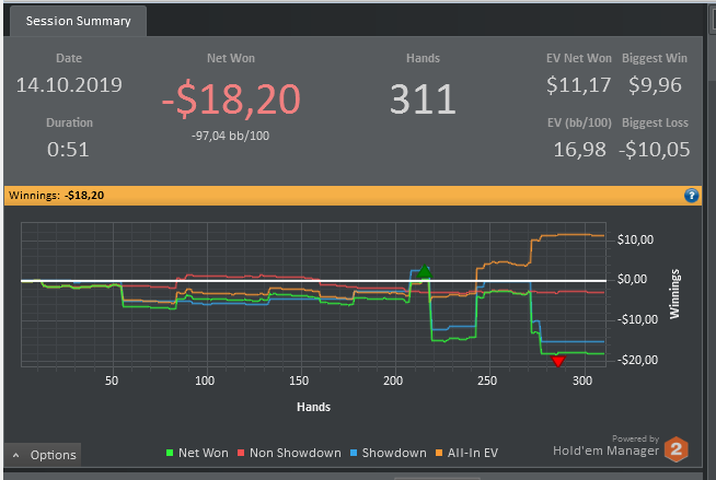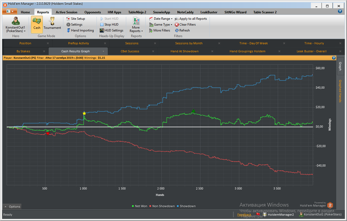 Сегодня случилась рекордно минусовая раздача в баксах(может, в бб было и больше) - минус 7.14$. Не хочу даже выкладывать - там была сложная динамика префлоп с моим финальным пушем QQ, и вроде чаще такие пуши минусовы и я себя потом клял на чём свет стоит, но мало того, что против короткого агрофиша(которого ещё даже статнейм не знает), и рега-коллера, которого хотел пушем "заизолировать" от фиша, так ещё и с глубоким стеком. Рег показал АА, и вроде я дурак, сам виноват, но потом понял, ЧТО было не так в этой раздаче, кроме моего оллина - он на СО коллил с этими АА против МР, и после говно-сквиза от фиша(5бб), опять коллил мой соответствующий крошечный 4-бет в 13бб - слоуплейщик хуев. Реально первый раз меня так крупно наебали слоуплеем префлопа По таким коллам (даже недо-4-бета) ему там можно было задать кучу разного говна, начиная даже с 99+мб бродвейные одномастные тузы какие-нить(учитывая, что он явно тоже хотел играть с фишом широко), а вот КК+ практически исключить - с ними не играют мультипоты добровольно, как правило. Фиш показал А5о. Финита ля комедия. А по БР всё равно пока плюсую по-тихому... Позже график выложу.