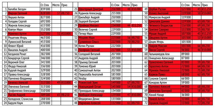 Всего в отборочных флайтах турнира PokerMatch Millions было сделано 703 входа. 72 спортсмена прошли в объединённый день и продолжили борьбу сегодня за кубок и призовые согласно таблицы ниже. Призовые выплаты: 1. ₴472.500 2. ₴346.250 3. ₴255.000 4. ₴192.500 5. ₴135.000 6. ₴106.250 7. ₴81.250 8. ₴56.250 9. ₴38.250 10-12. ₴30.000 13-15. ₴25.000 16-18. ₴20.000 19-27. ₴15.000 28-36. ₴12.500 37-45. ₴11.250 46-54. ₴10.000 55-63. ₴8.750 64-72. ₴8.250 Всего - ₴2.500.000