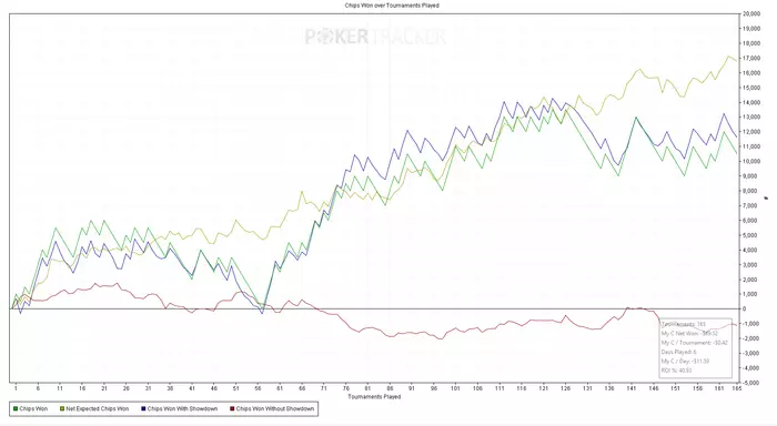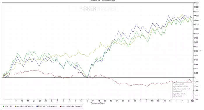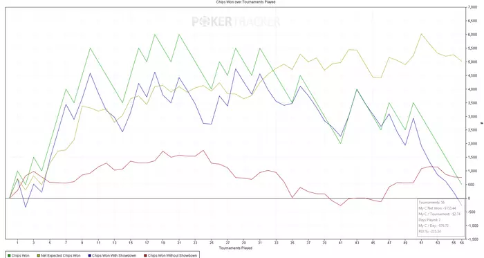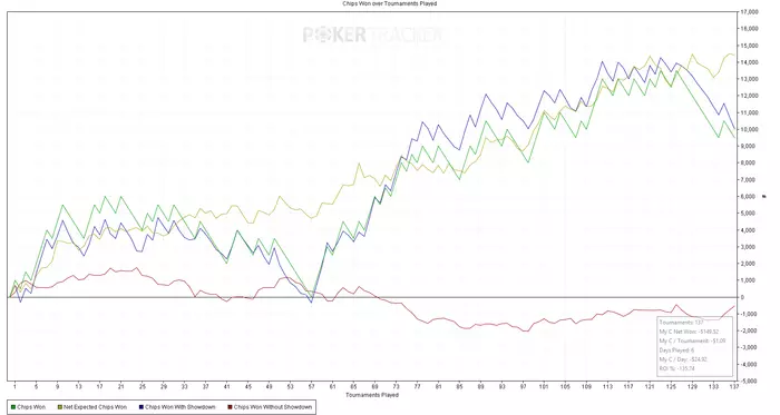 Продолжил играть на Ред Старе. И тут падение продолжилось. Я буду максимально честным. Проиграв ещё 100 долларов, график покажу. Я тильтанул и включил коротыши... Включил и.... естественно проиграл 4 игры, 1-а победа на икс 2, и в заключительной вылет на икс 4 на префлоп олл инне КJ в К9. Из позитивного, то что это самый непродолжительный мой тильт был. Бывало что я мог ночь в них валить. Но потеря и этих денег тоже не приятна для банкрола и для меня. Хотя казалось бы, это же покер, а вдруг повезёт. Нет, гораздо чаще вы будете наказаны за свой тильт, чем весело улыбаясь выйдите со столов. Во первых игра становится не оптимальной, во вторых дисциплина уходит погулять и выходит обиженный на всё ребёнок, который кричит да ну на, да вы что специально, да ГСЧ должно отдать!!! И тогда становится очень сложно остановиться. Никогда не любил игровые аппараты, но есть друзья, которые раньше туда захаживали, и вот дожидаясь их и постепенно трезвея я много такого встречал. Должен отдать, должен отдать. Но никто ничего конечно не отдавал:)