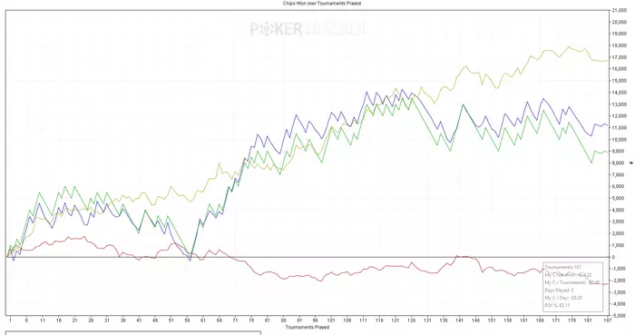 Залился. Начал играть на коротышах увидел много чудес КД в КВ проигранные и т.п., что в принципе нормально. Закончил игру префлоп выставлением Д9 в Д7, получил девятку на флопе, а тёрном и ривером посмотрел на 77. Но сам виноват - куда полез, переехали вдоль и поперёк, а на ЕВ даже не отразиться, только опять разбавляю количество фишек с турнира. Проблемы как игрока в покер похоже у меня слишком велики. Да недоборы, да переезды, но сам ошибаюсь, тильтую, играю в не оптимальный покер. Залажу туда куда не стоит. Я не робот, который выштудировал всё и печатает бабки на дистанции. Смогу ли я плюсовать. Очень большой вопрос. Буду пытаться расти и изменяться к лучшему.
