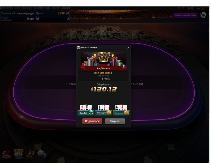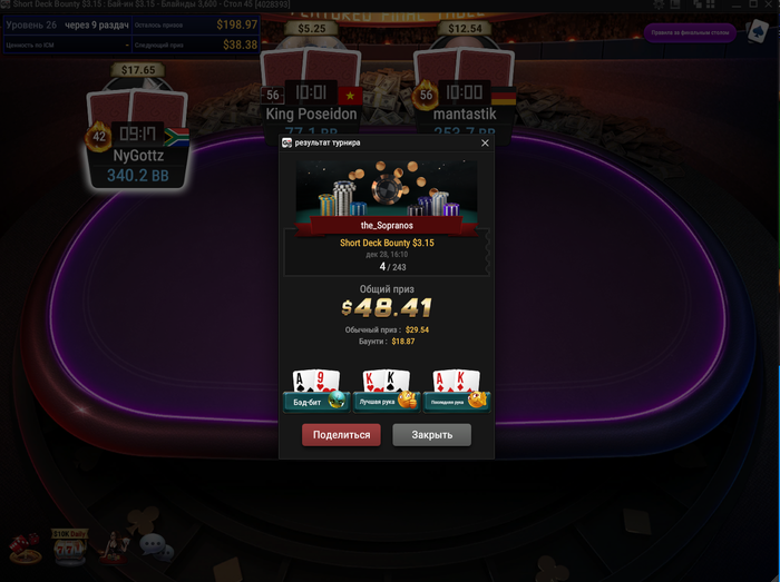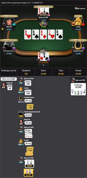 На BB AQo и он предлагает 2 борда,понятно хочет поймать Q ,но UTG соглашается и они едут 2 борда и в оконцовке делят.