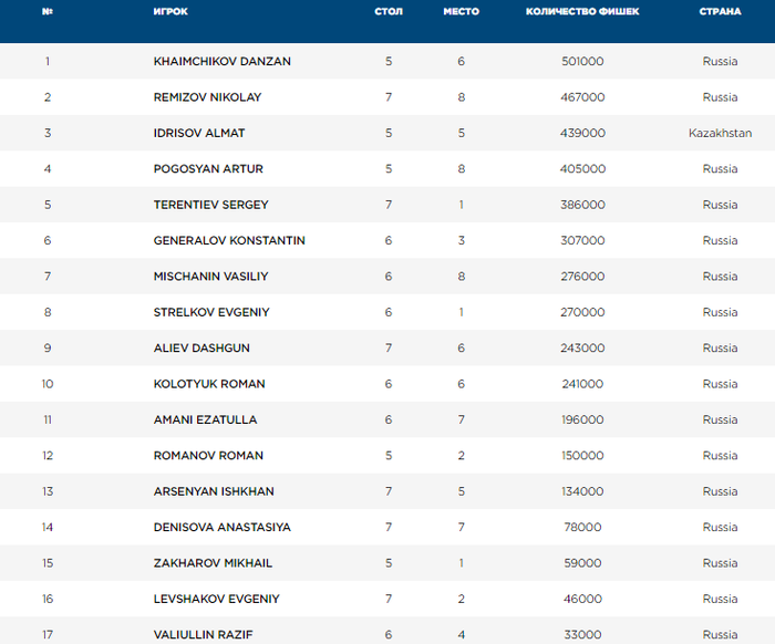 На данный момент за столами 46 человек, включая победителя вчерашнего Russian Poker Championship Вячеслава Балаева и занявшего в том же турнире 4-е место Руслана Митяева.