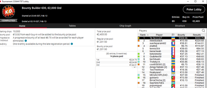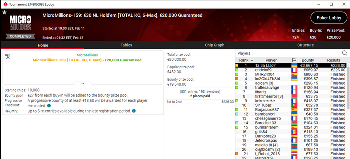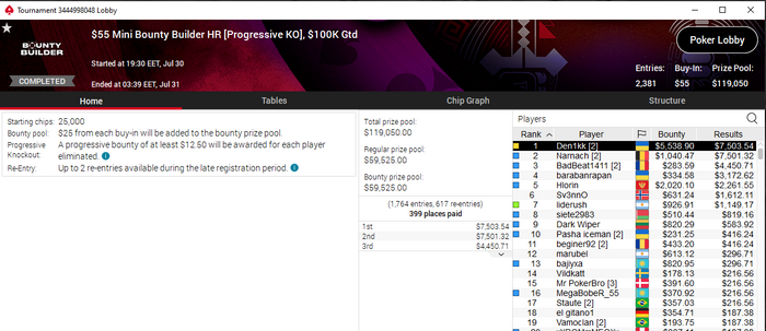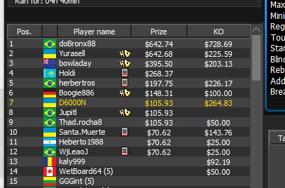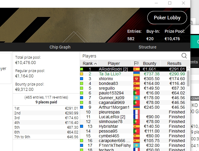 Была 1 финалка, которую благополучно слил, дорогая финалка, за первое 10к примерно евро + билетик на мистери баунти, мерзкое чуство конечно не отпускает, тильтун из за того что поехал с низу за нок в 500 евро, но там было 8ББ пуш, у меня 22, на флопе 2, там КК , ривер К, не выложи короля, раздача +1.5к евро. Ну бля нах 2 выкладывать . И след раздача, задарил 30 ББ , а мог точно пересидеть 2 фишей и минимум получить 3к евро, но с эмоциями пока проблемы...ебучая 2 нахуй ее выкладывали, во всем виновата 2-ка, загнала в тильт