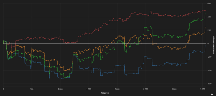 Первую тысячу усиленно блаф кетчил , на шд постоянно оказывалось велью у оппов. Потом вспомнил девиз ВДВ- "Никто кроме нас", раз они не блефуют, это буду делать я. Вскоре подвезли переапчик. Ещё тысяч 5 сыграл в румах без статов. Фишей за столами, конечно меньше чем на нл100 во много раз. Выводы делать рано, но пока уровень игры не впечатляет. Выиграл около 2к.