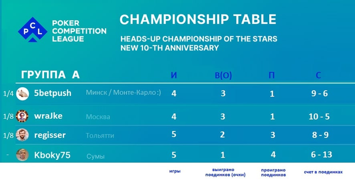 Таким образом, первую строчку (и прямой выход в 1/4 финала) wraJkeупустит, лишь, в том случае, если проиграет последний матч группового этапа, а 5betpush (drholdem) одержит победу. Но, возможно всё, будем ждать развязки в данной группе