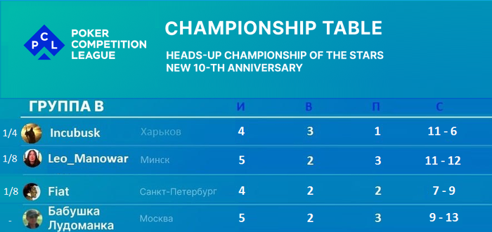 Группа смерти для Бабушки Лудоманки - двое опытных фанатов хедзапа - Fiat, Leo_Manowar один из которых, является топ-тренером и чемпионом одного из СКУПов за 1k$ и опытнейший МТТ-про Incubusk , ярко стартовавший в чемпионате. Но Ольга неожиданно для многих преобразилась во 2-м круге и включилась в борьбу, чем можно только восхищаться и в предвкушении ждать решающих матчей, которые будут переполнены интригами.