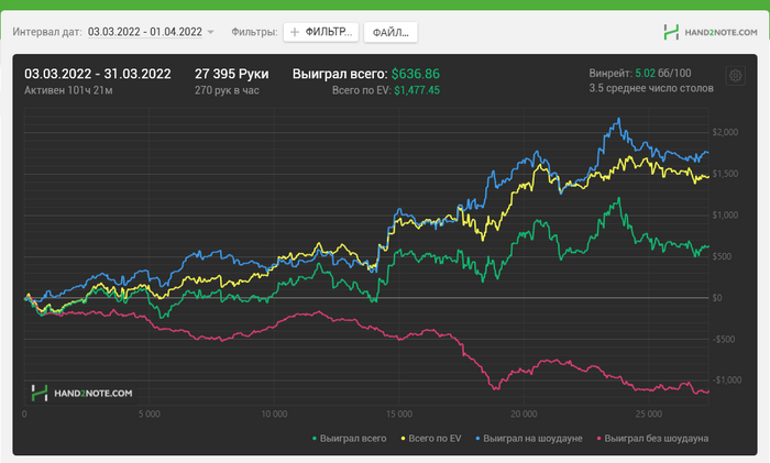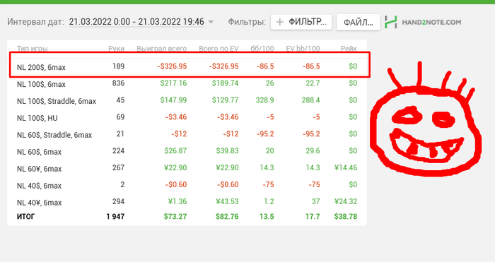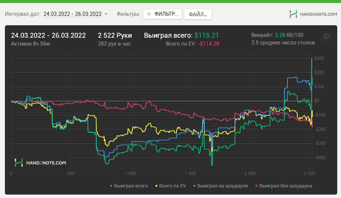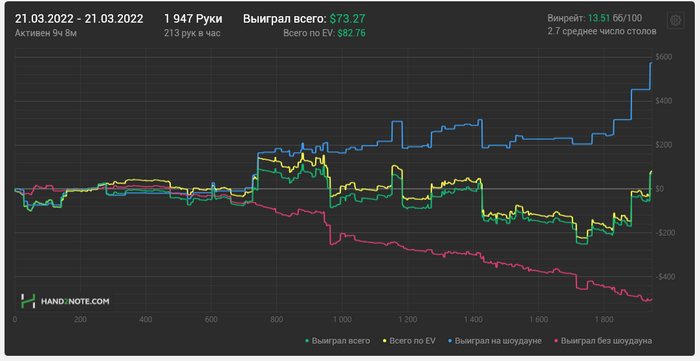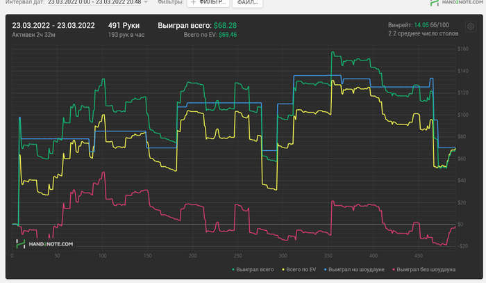 2. На данный момент я играю 270 рук в час. Минимум 70 рабочих дней. 100 000рук/70=1428 (с запасом 1450 рук в день нужно будет отыгрывать) . Это 1450/270= 5.5-6 часов в день. В последнее время я играю по 4-5 часов в день.