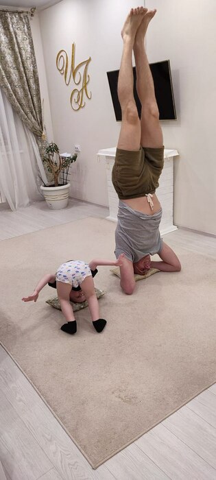 В таком положении я стою ежедневно по 3 минуты . Можно начинать как мой сын, только с руками . Затем упор возле стены , и дальше учиться держать баланс. Последние 2 упражнения усиливают приток крови к голове, думаю по мне видно .Очень бодрит мозг и оказывает положительное влияние на весь организм.