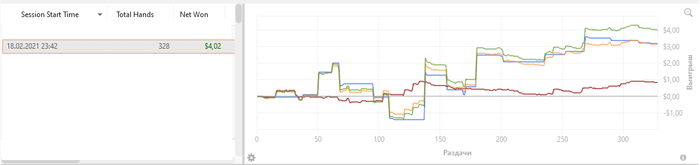 Вечерняя сессия получилась коротка. Всего 300 рук. Далее пришлось прерваться. Но посвятил эту игру ее Величеству кнопке "Фолд".