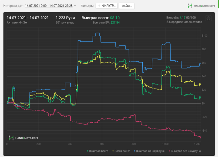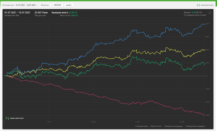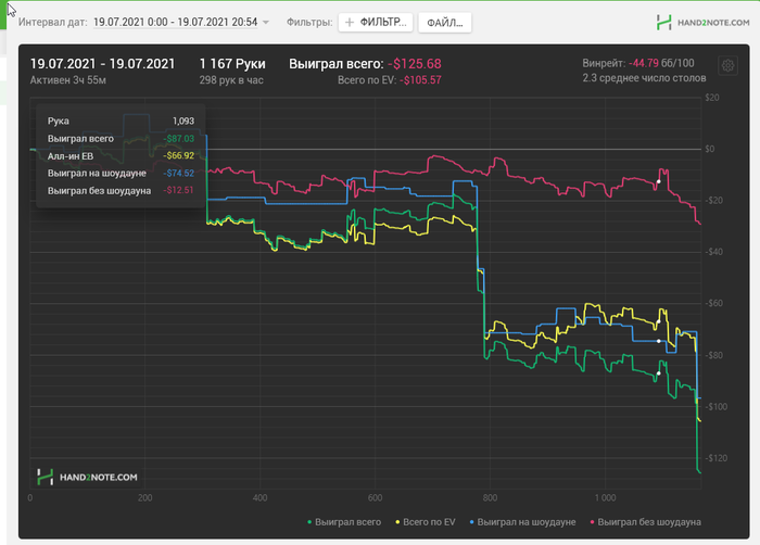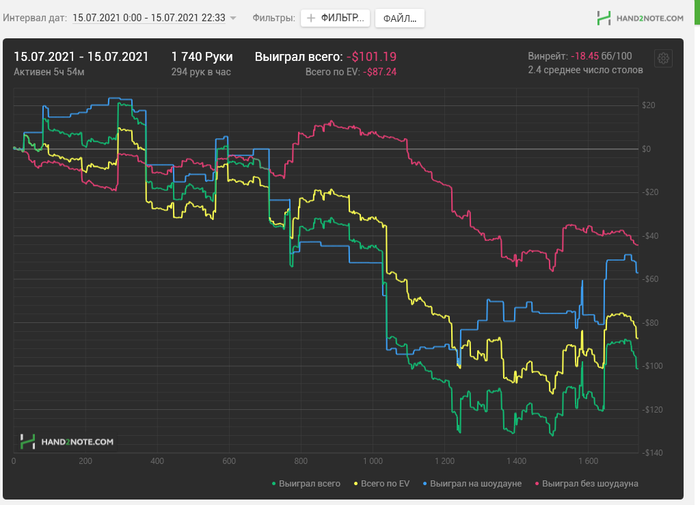 В общем прошло пол месяца. Недобор существенный. Но в целом доволен, хоть не в минус иду. 25ка шотается уверенно и хорошо, надеюсь что дальше облома не будет. В конце месяца уезжаю с семьей на машине, на море. Нужно до 30 числа успеть добить чедендж, обещали $200. В Питере невыносимая жара, играть сложно, а сейчас играть нужно больше в два раза. Вот сегодня потратил 6.5 часов на игру. Еще как на зло у меня 4-ый стол не открывается, а это + 1-1.5 часа игры.
