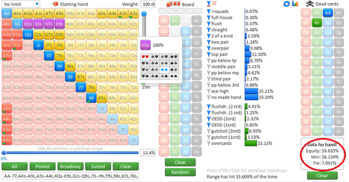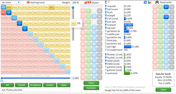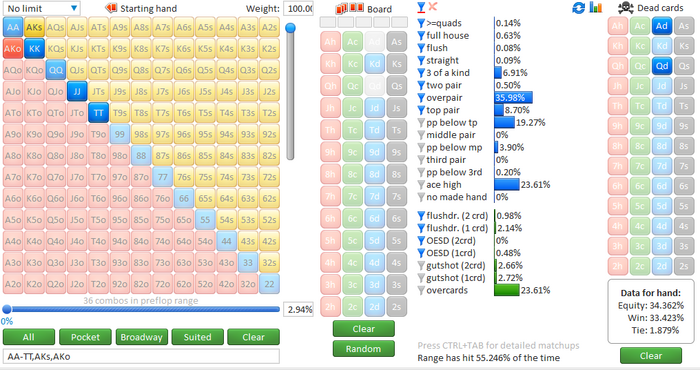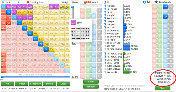1) Если против нас играет оппонент с широким 3бетом, например 15%, то, возможно, станет удивителен тот факт, что АКо имеет на 2.2% больше эквити, чем AQs, если мы говорим про префлоп. Я забил +- ренж агрессивного рега добавив с весом Ах руки и часть бродвея, набежало 15%, но из-за блокеров отображается 13.4%