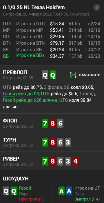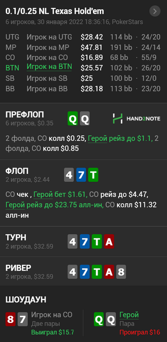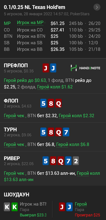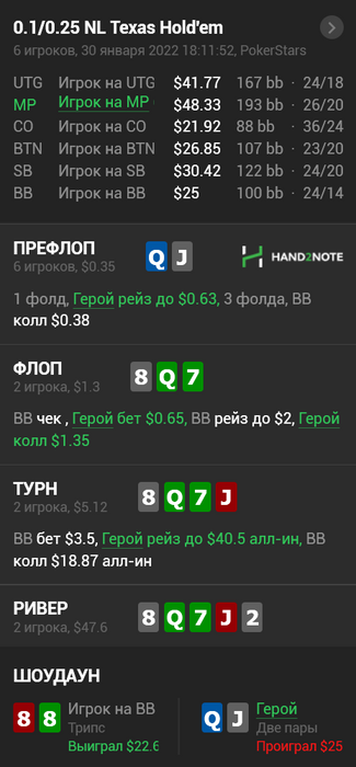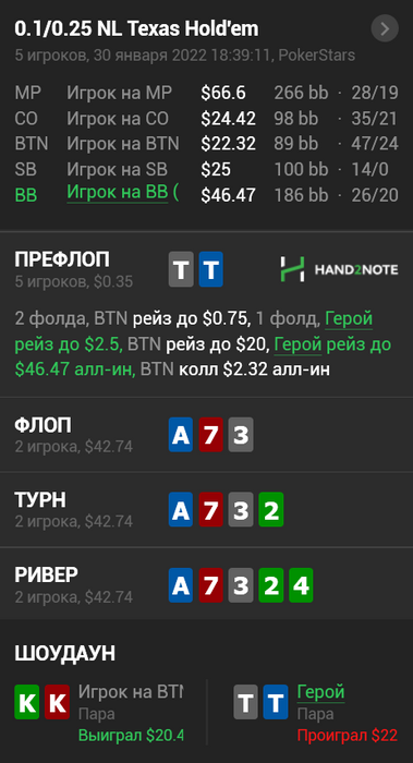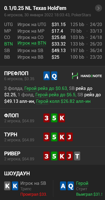 BSOD094 @ 31.01.22Не всегда это так, AQs можно играть таким образом против очень широкого 3бета, вполне себе ок на вэлью, так же как и ТТ.