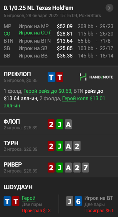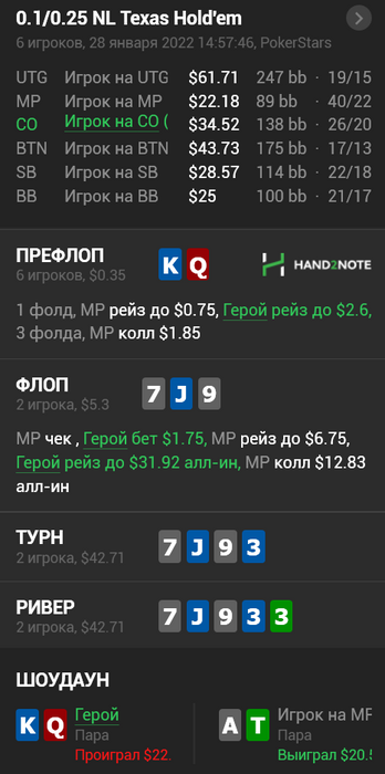 5) И прям через раздачу против него же. Тут я почему то подумал, что из-за прошлой раздачи он решит доблефовать ривер если будет без попадания.