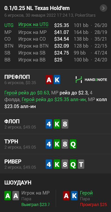 Оверплей, полная шляпа. Ты пушишь зачем то АК, из утг, на Что ты надеешься когда опп жмёт колл? AQ AJ? Ну нет. В лучшем случае ты увидишь Сплит, но чаще монетка или очень позади.